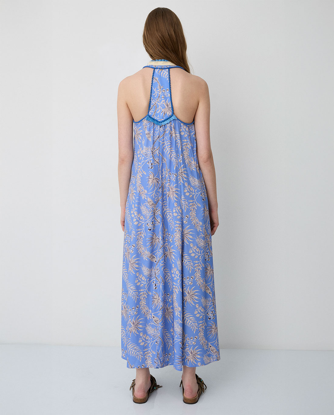 Abito lungo stampato di BSB realizzato in tessuto stretch dalla texture morbida. Il modello presenta un design senza maniche con scollo a V, arricchito da un inserto a pannello sulla scollatura. Caratterizzato da una vestibilità regolare, il capo è completato da uno spacco laterale che ne enfatizza il movimento e la fluidità.
