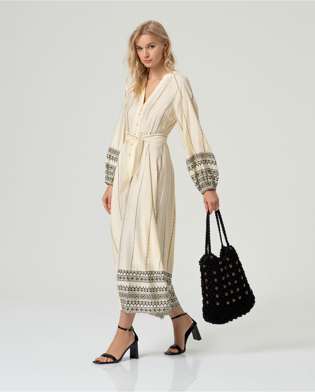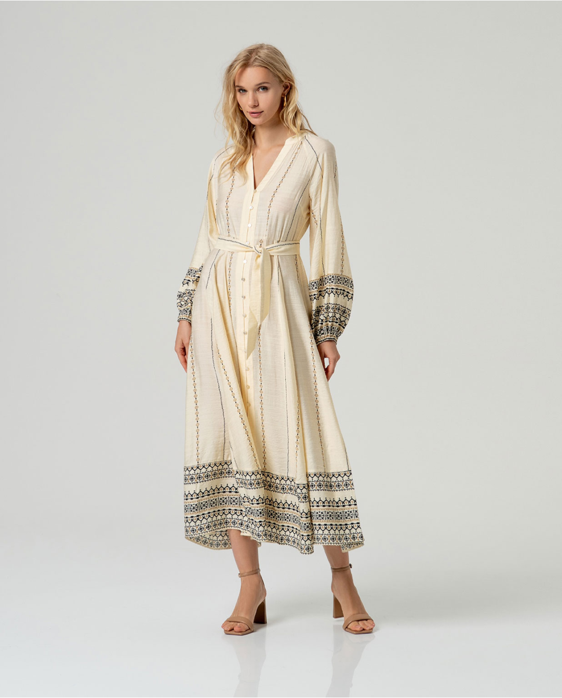 Abito midi Surkana in tonalità crudo, caratterizzato da un raffinato scollo a V e maniche lunghe con polsini elastici. Il design è impreziosito da un ricamo geometrico a sviluppo verticale e da fasce ricamate che rifiniscono orlo e maniche. Il modello presenta una chiusura frontale con bottoni e una cintura coordinata nello stesso tessuto per definire la silhouette.