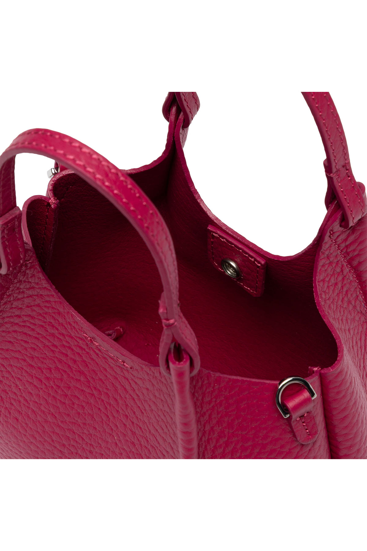 Il Pink Salt, un rosa cipriato di rara eleganza, amplifica la sensazione di morbidezza della pelle bubble, creando un effetto visivo sofisticato e contemporaneo. I profili superiori in pelle martellata introducono un dialogo di texture che arricchisce ulteriormente il design, mentre i doppi manici in tono completano la silhouette con coerenza e stile.