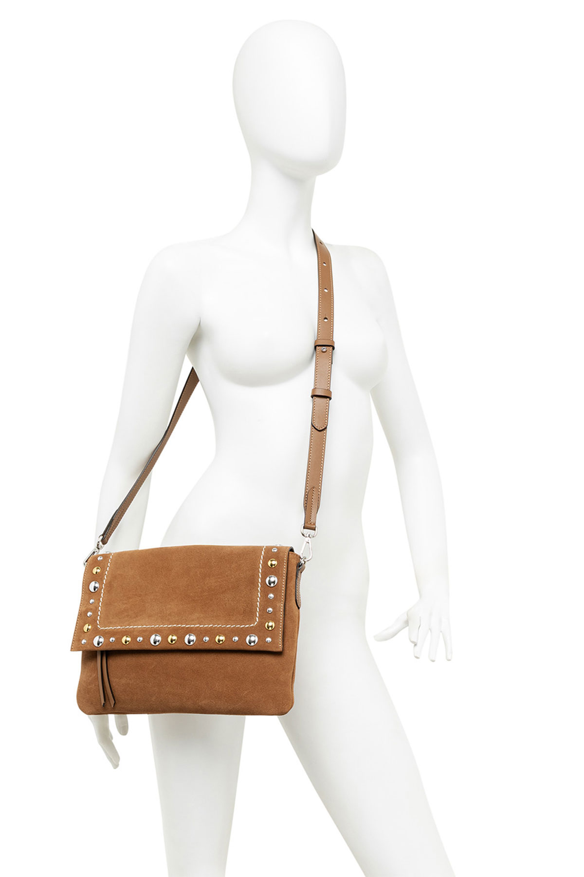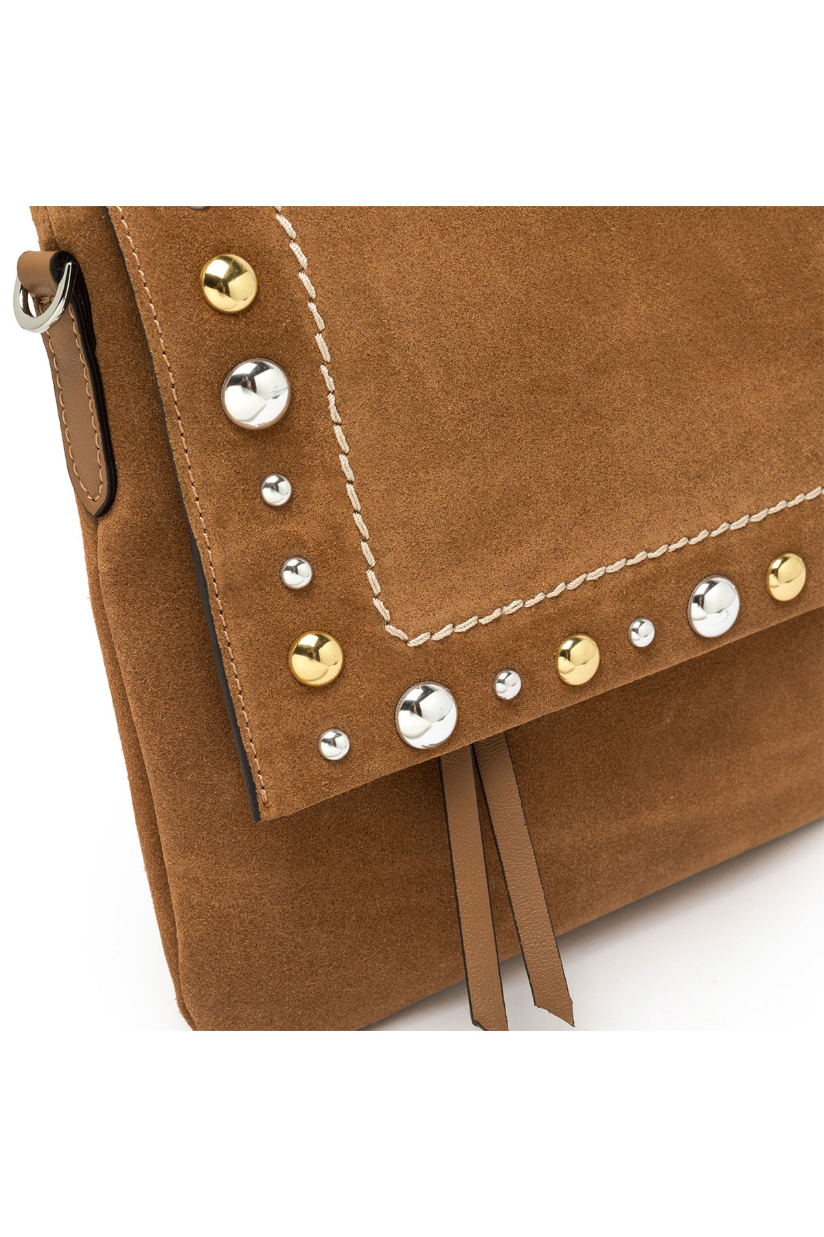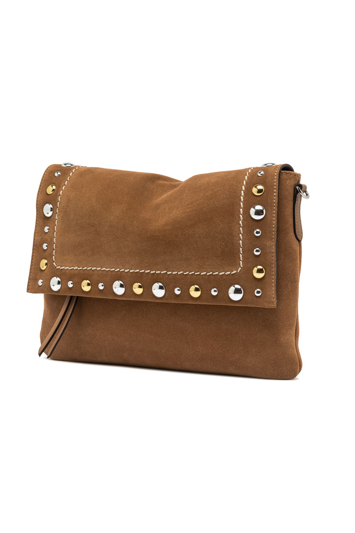 La Elisa Large di Gianni Chiarini Firenze porta la silhouette morbida e allungata della linea Elisa a nuove dimensioni: pelle scamosciata cuoio, anima Western con impunture e borchie, doppia chiusura e doppia portabilità a spalla o crossbody per chi non vuole scegliere tra stile e capienza.