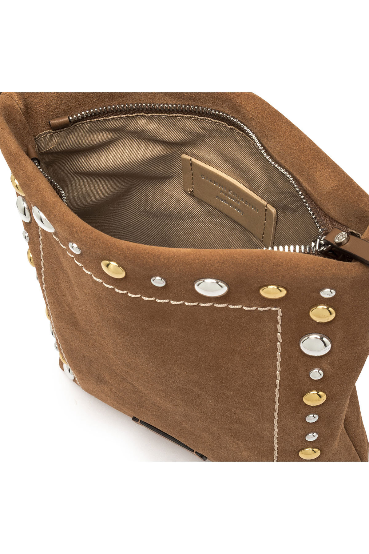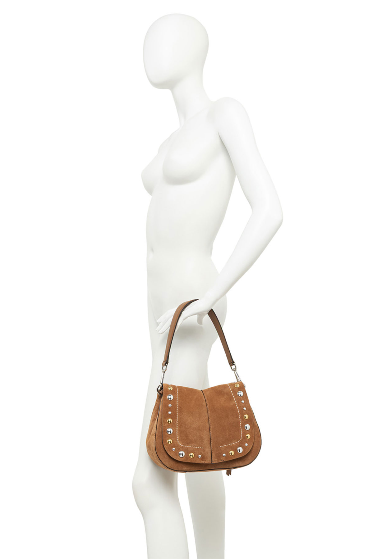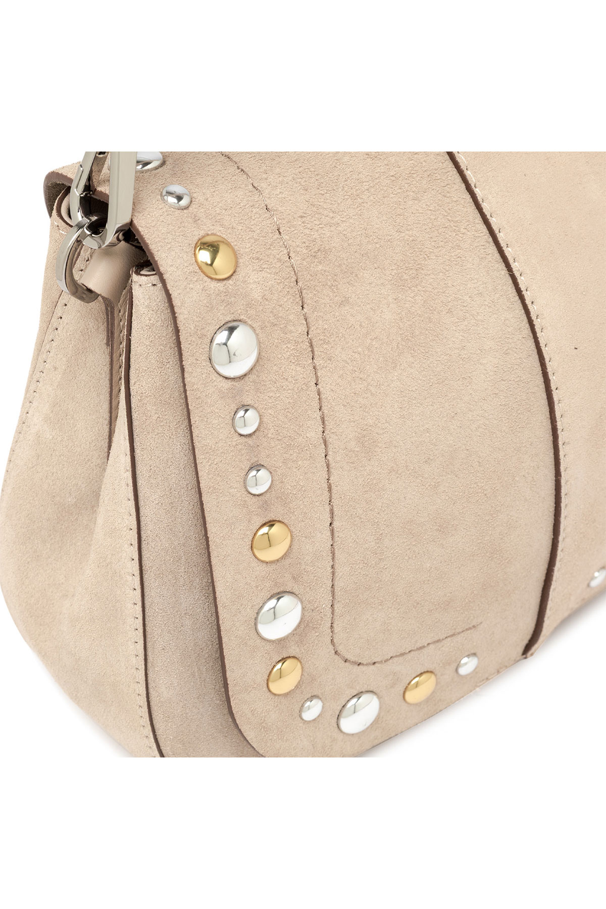 Realizzata in pelle scamosciata nel delicato tono nude (rosa), la sua superficie morbida e vellutata viene animata da impuntura a contrasto e borchie decorative, dettagli che le regalano un carattere Western sofisticato e mai banale.