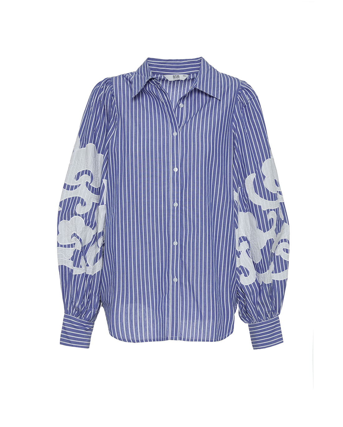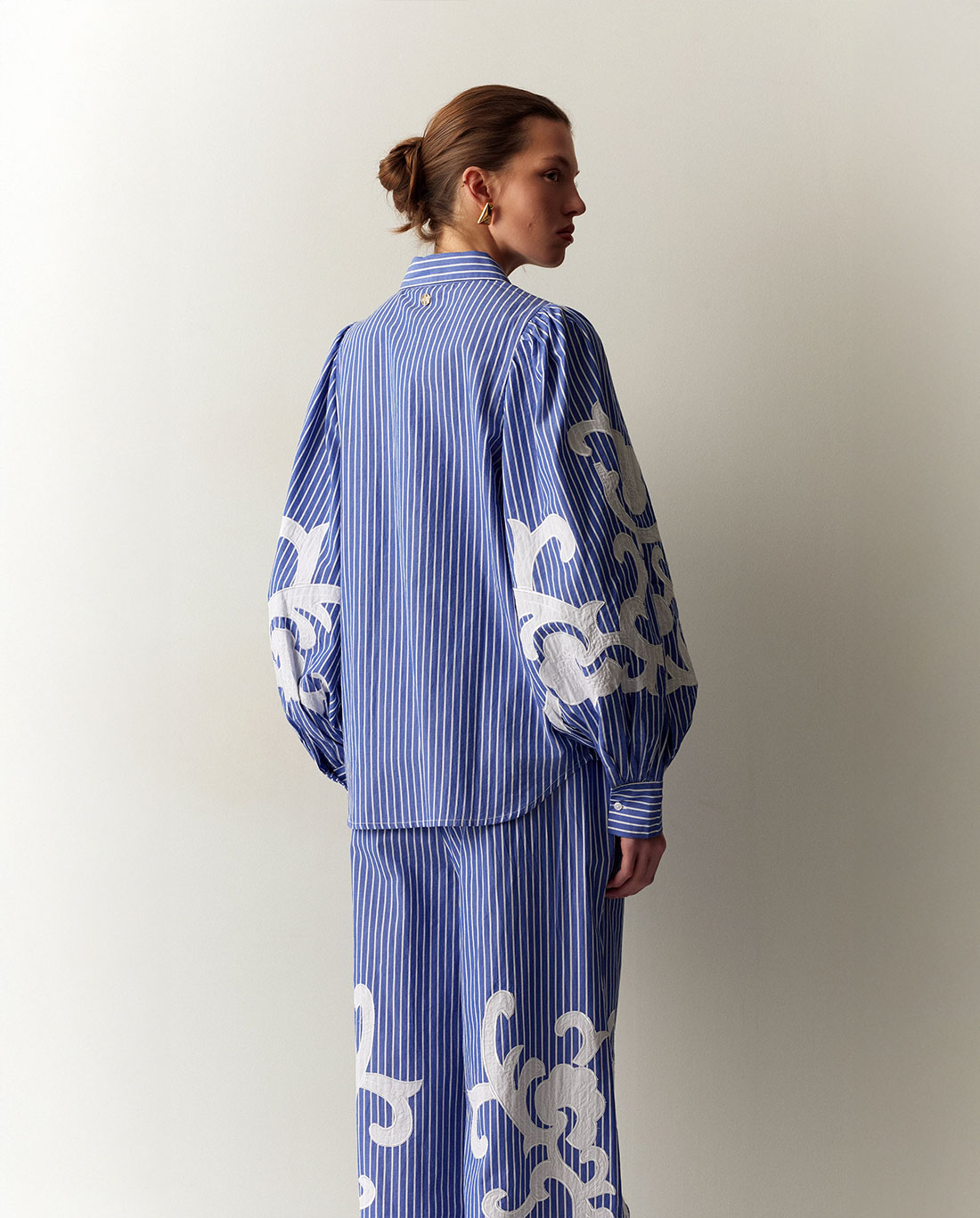 Camicia a righe in puro cotone, caratterizzata da un taglio ampio e confortevole. Il modello presenta maniche lunghe a palloncino, finemente impreziosite da dettagli ricamati che ne esaltano il design. Completano il capo il classico colletto e la chiusura frontale con bottoni, unendo lo stile tradizionale a una linea contemporanea e ariosa.