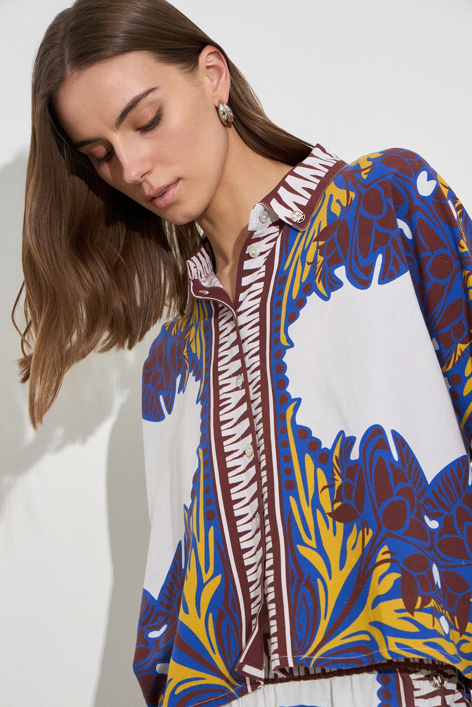 Camicia stampata a maniche corte con colletto, chiusura a bottoni e vestibilità ampia. Realizzata in tessuto effetto lino, leggera e traspirante, perfetta per un look estivo casual e di tendenza. La modella indossa la taglia S ed è alta 180 cm. Ideale per outfit versatili e confortevoli.