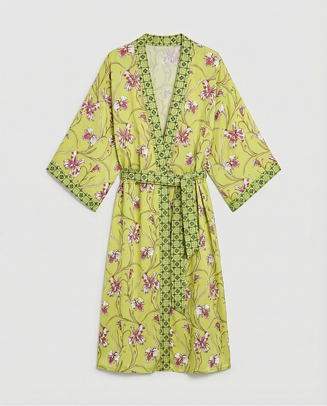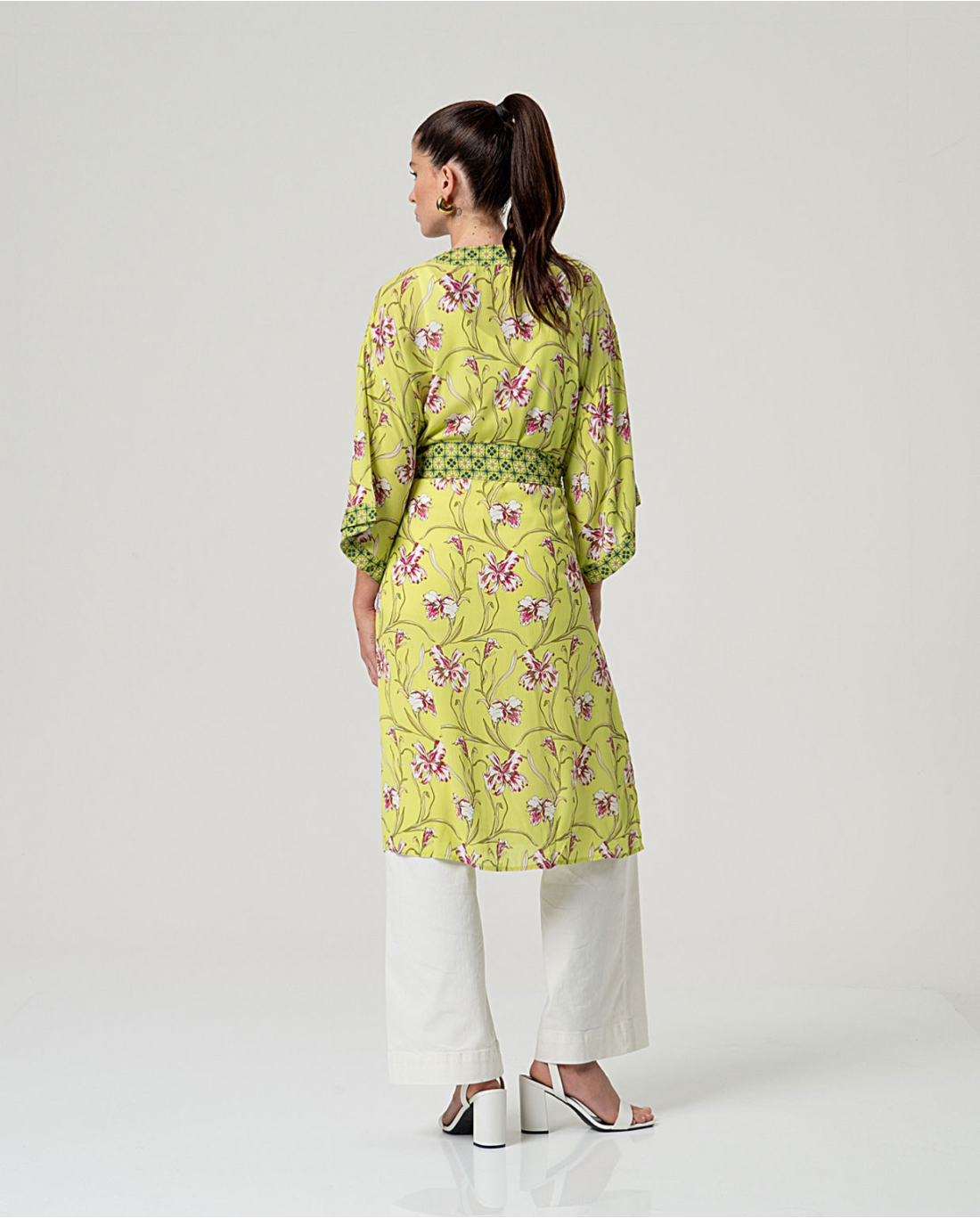 Kimono fluido in 100% viscosa, caratterizzato da un tessuto leggero e una vivace colorazione verde acido. Il design presenta una stampa floreale a piccolo formato, linee aperte e maniche ampie dal taglio classico. La silhouette è personalizzabile grazie alla presenza di una cintura regolabile coordinata che permette di modulare il fit.