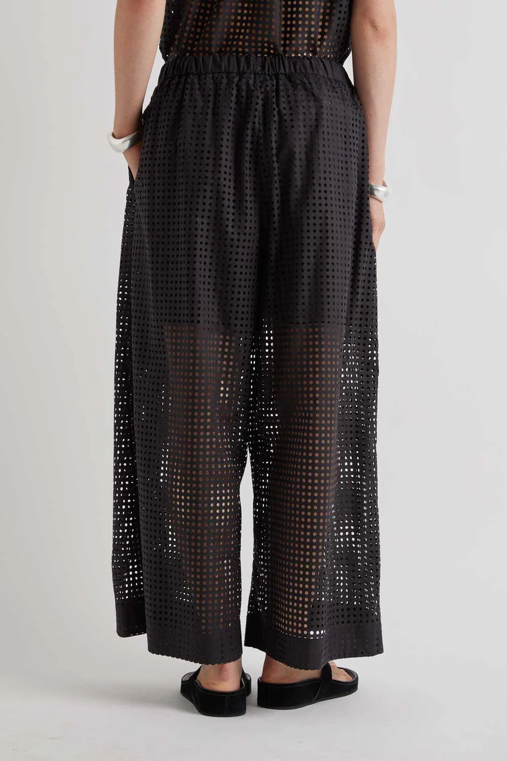 Pantalone leggero e contemporaneo, realizzato in tessuto laserato che dona un effetto raffinato e traspirante. La gamba larga assicura comfort e libertà di movimento, mentre le tasche laterali aggiungono funzionalità. La vita elasticata sul retro garantisce una vestibilità comoda e adattabile, rendendolo perfetto per look estivi freschi e versatili.