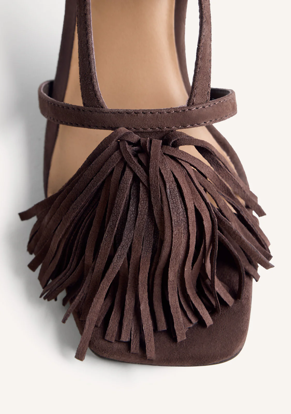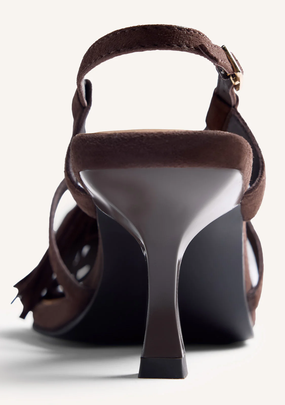 Dal carattere deciso e sofisticato, i sandali Lucak in pelle scamosciata si distinguono per le frange decorative che aggiungono movimento e personalità. Il tacco sottile slancia la silhouette con eleganza, mentre la soletta imbottita assicura comfort durante tutta la giornata. I cinturini regolabili alla caviglia garantiscono una calzata stabile e femminile. Realizzati interamente in pelle con suola in gomma flessibile, sono perfetti per completare look estivi ricercati e di tendenza.