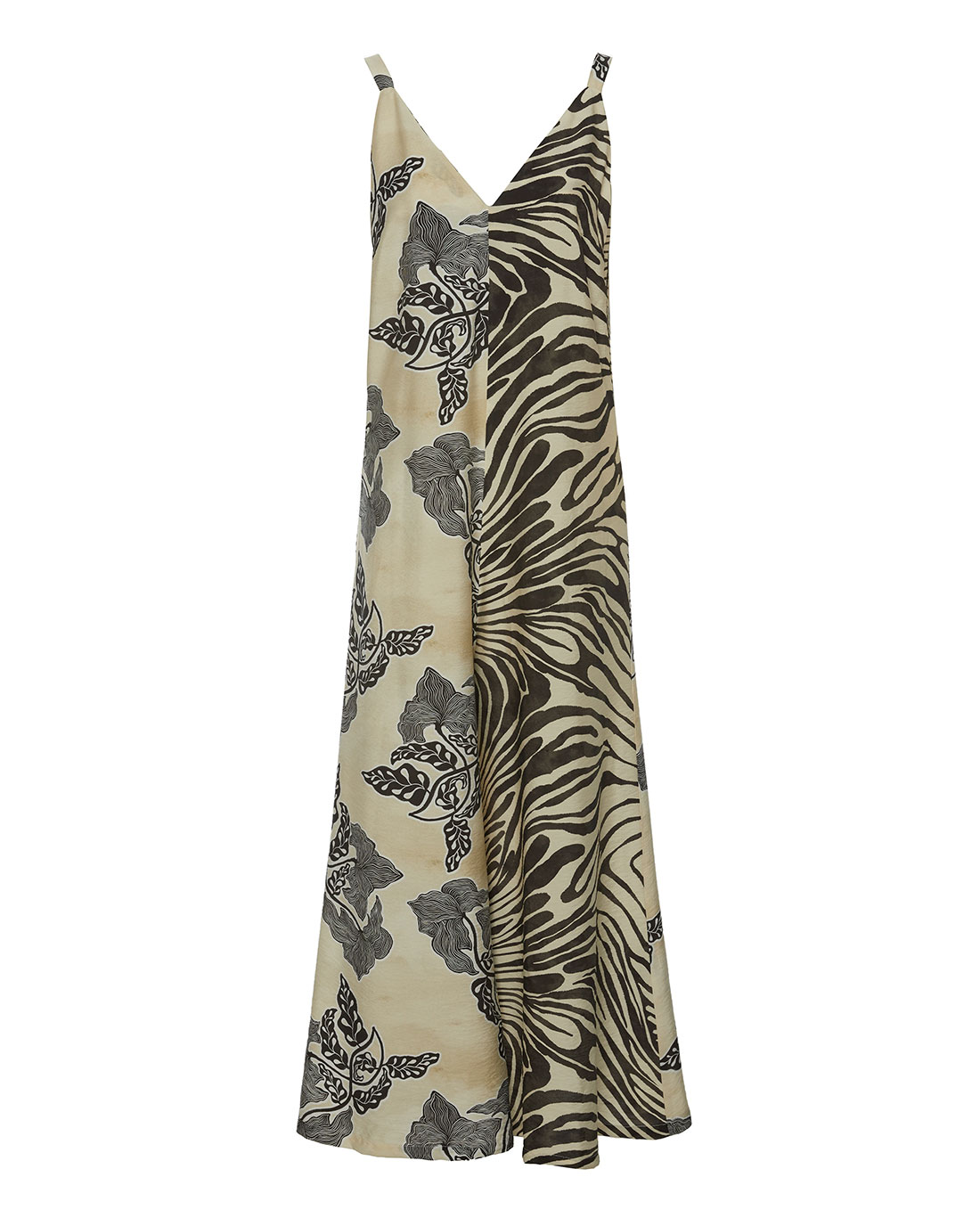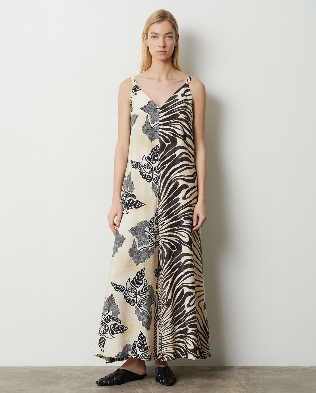 Tuta lunga stampata caratterizzata da una texture morbida e una vestibilità ampia e fluida. Il design presenta spalline sottili e un classico scollo a V, offrendo un fit confortevole e scivolato sulla silhouette.