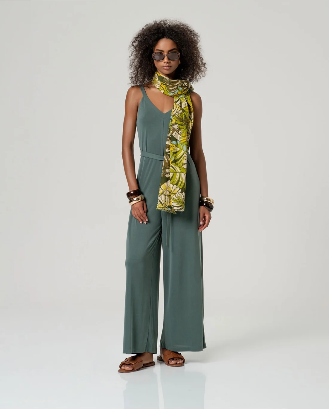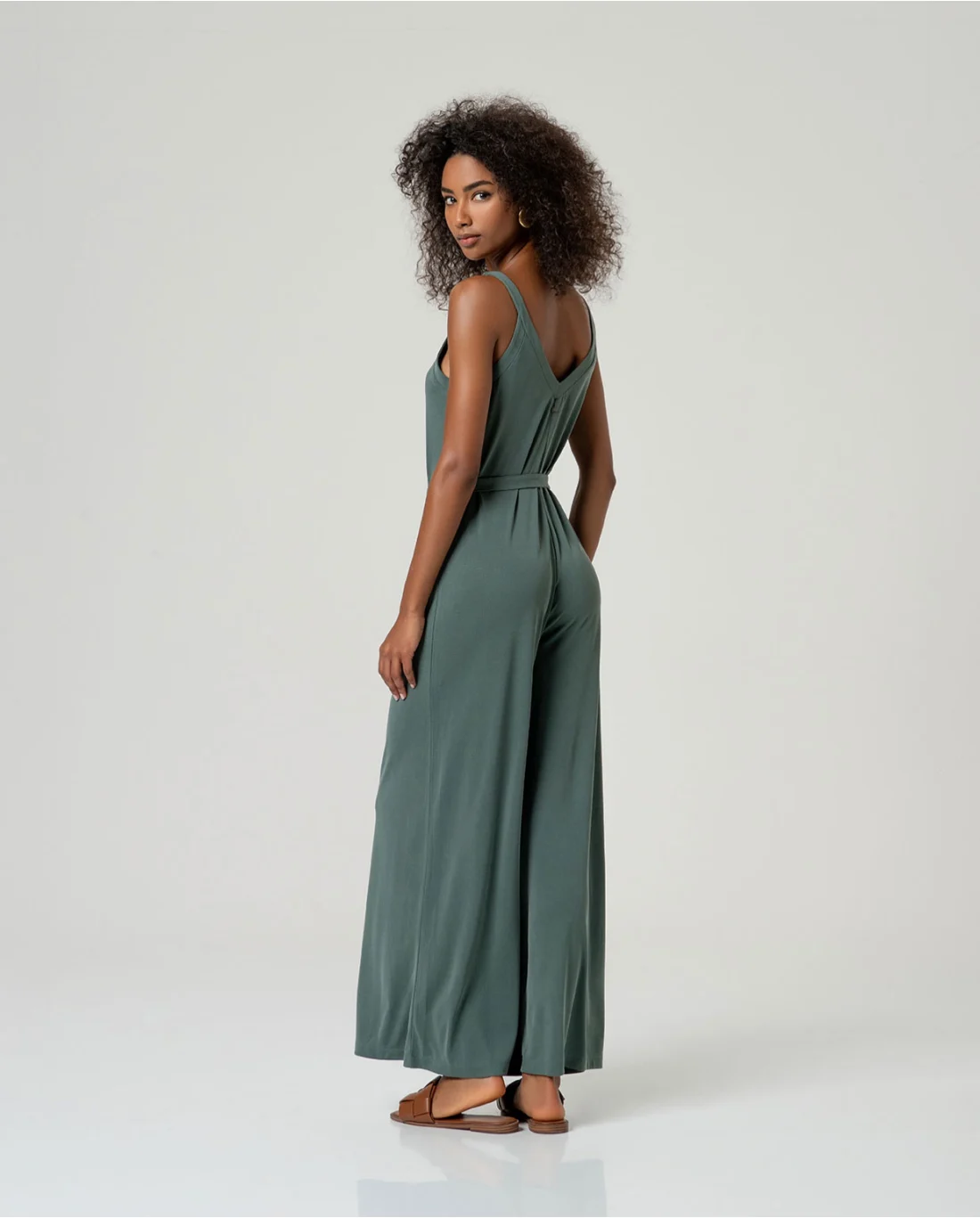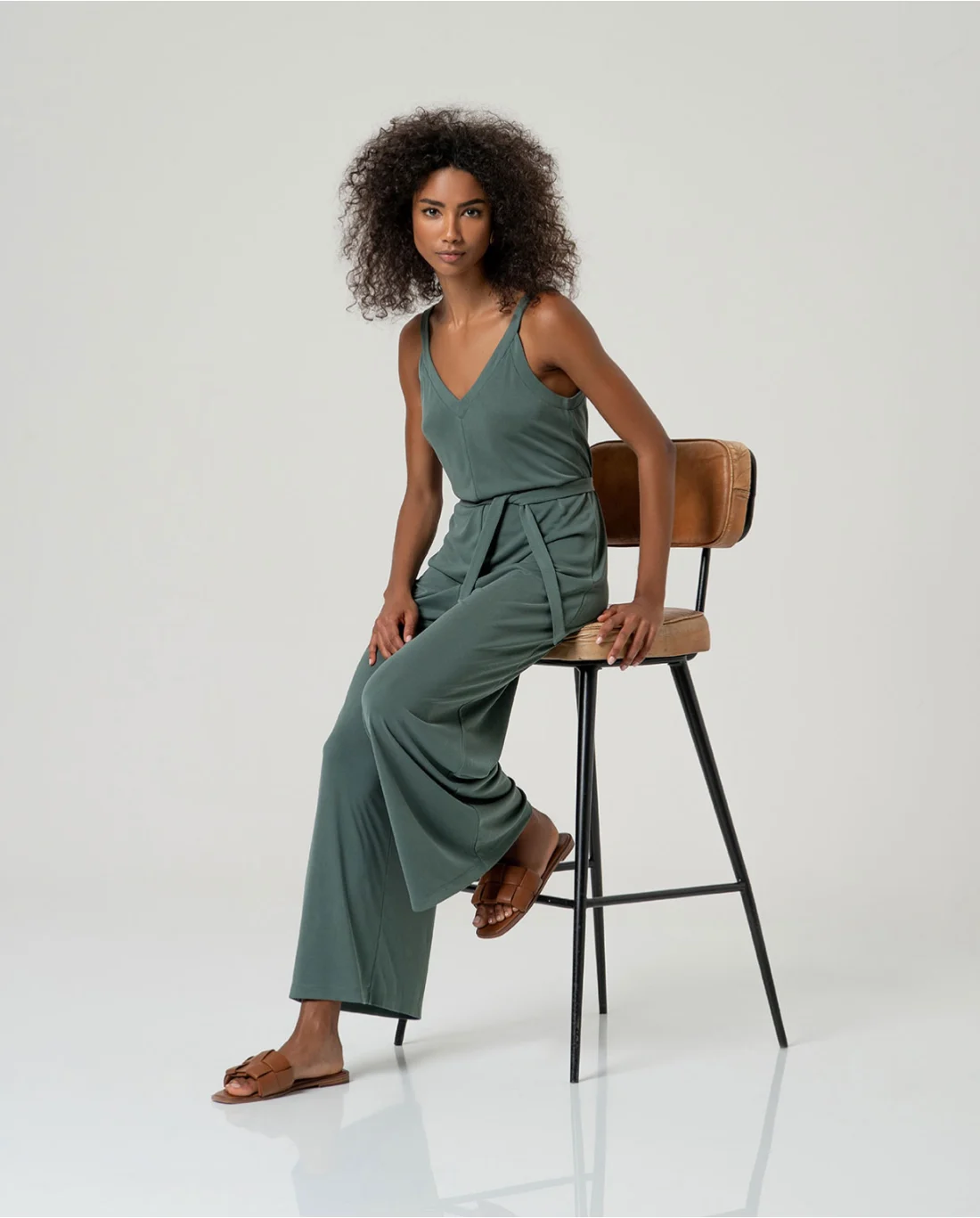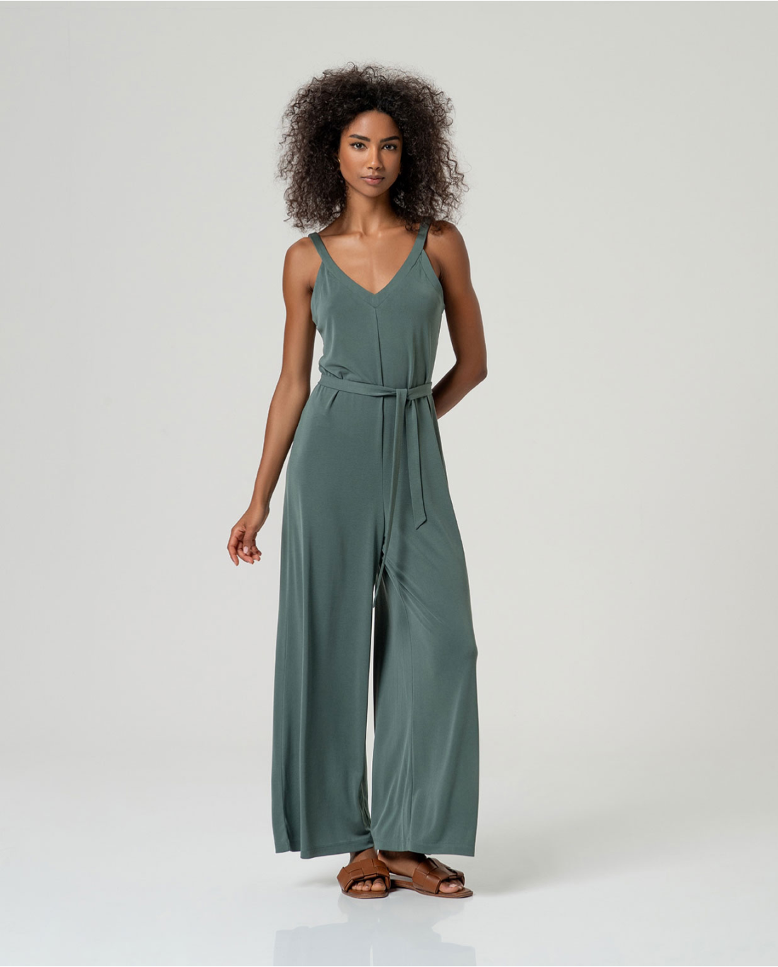 Tuta lunga in tonalità verde bottiglia, realizzata in un tessuto fluido che combina modal e poliestere. Il design essenziale presenta sottili spalline e uno scollo a V, abbinati a una vita regolabile che permette di personalizzare il fit. La parte inferiore è caratterizzata da una gamba larga dal taglio dritto che assicura comfort e movimento. Capo ideato e progettato a Barcellona.